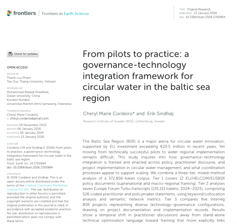 Cordeiro, C. M., & Sindhøj, E. (2026). From pilots to practice: A governance-technology integration framework for circular water in the Baltic Sea Region. Frontiers in Earth Science, 14, Article 1750984. https://doi.org/10.3389/feart.2026.1750984