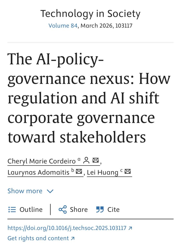 Cordeiro, C. M., Adomaitis, L., & Huang, L. (2026). The AI-policy-governance nexus, How regulation and AI shift corporate governance toward stakeholders. Technology in Society, 84, 103117. https://doi.org/10.1016/j.techsoc.2025.103117